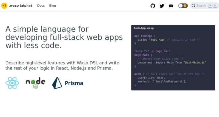 Actually, the company Wasp believes writing boilerplate code doesn’t have to be a part of web app development. Wasp is an open-source, declarative DSL for developers who want modern frontend, backend, and deployment experiences without writing boilerplate code. With Wasp, you can describe high-level features with Wasp DSL and write the rest of your logic in React, Node.js, and Prisma.
